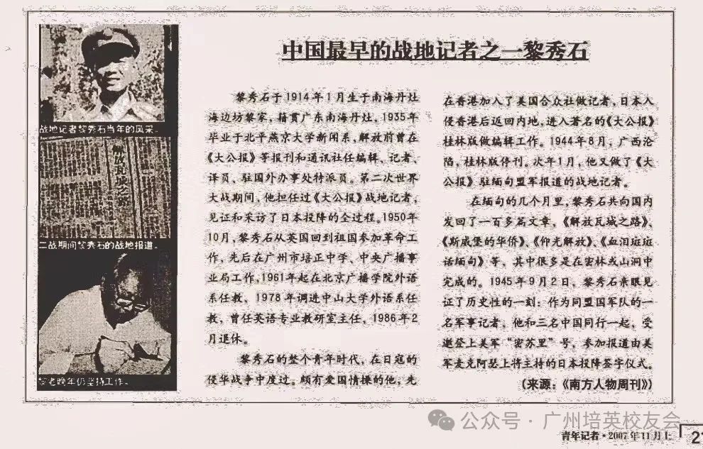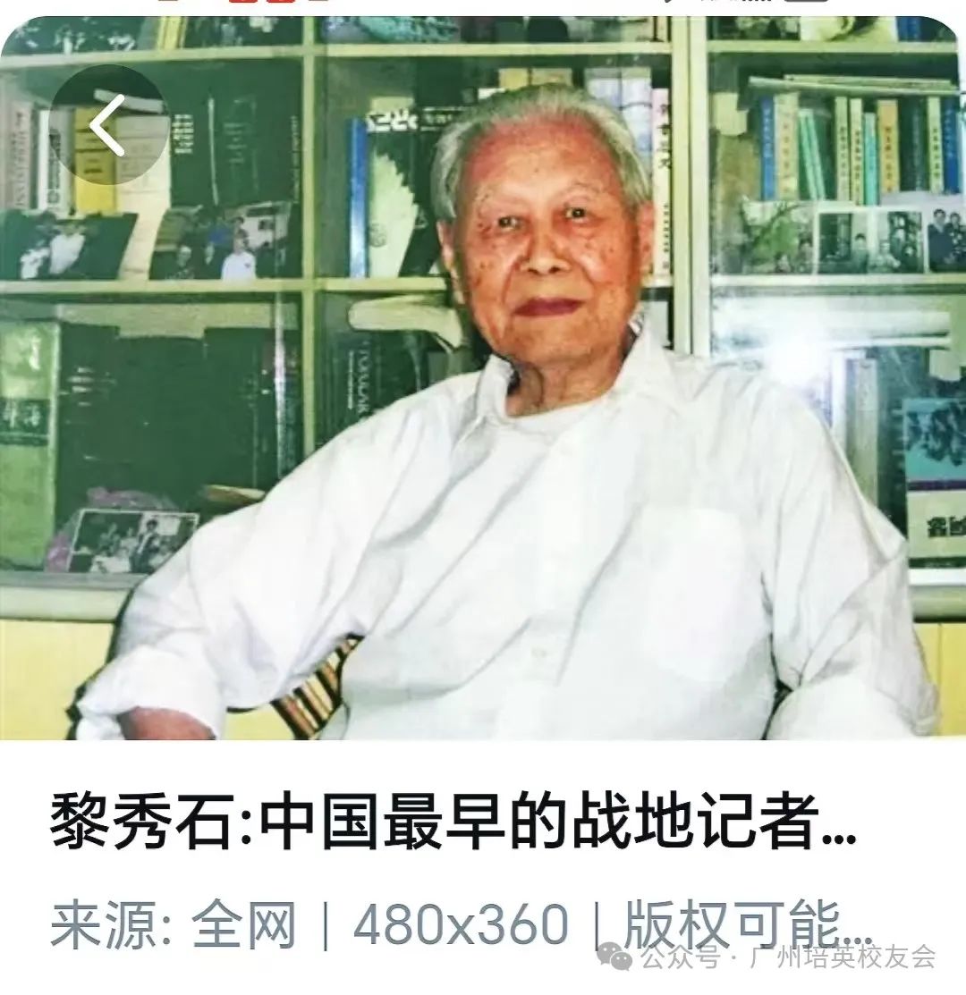 而广州培英黎秀石校友,是1931年在培英毕业(平社)的高材生。黎秀石是广东省南海市人,在学期间,兴趣广泛,文学修养功底深厚,英语造诣极高。受祖父和父母辈的影响,黎秀石从小就立下一颗爱国之心。