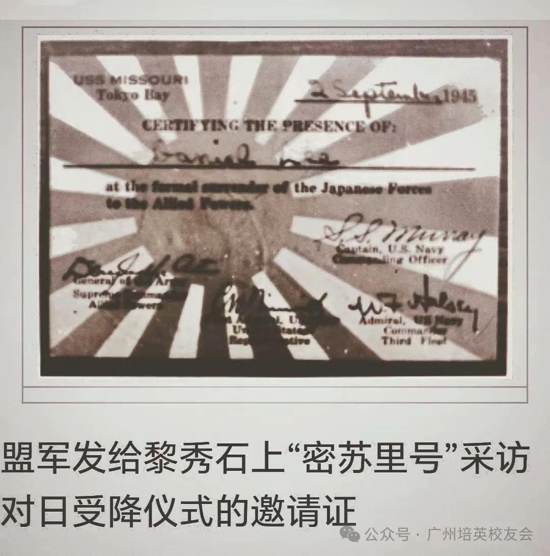 九月二日,黎秀石与世界其他二十多个国家280名记者一起,在东京湾「密苏里号」军舰上采访日本投降签字仪式。他怀着万分兴奋的心情亲眼看到日本外相重光葵、陆军参谋长梅津美治郎分别代表日本政府、日军大本营在投降书上签字。目睹了中国全权代表徐永昌将军以及美、英、苏、法、澳、新、加、荷等国的代表在受降书上签字。