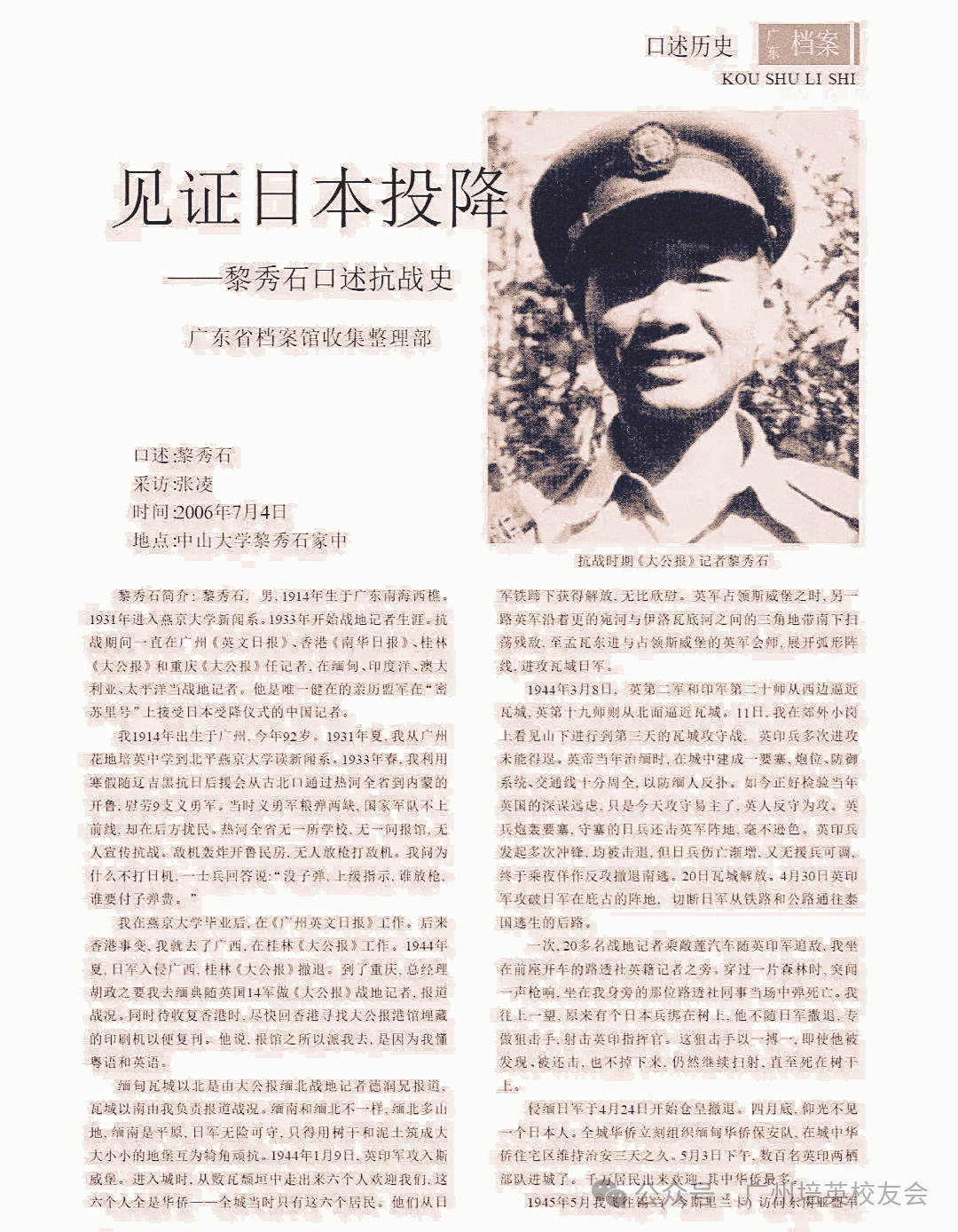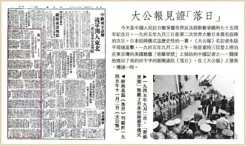 《见证日本投降》日本投降签字见证人,依据历史档案的记载,1945年日本投降,在密苏里号上签订投降书的历史性时刻,中国在现场的三个记者当中,有两个是《大公报》的记者,一个是黎秀石,一个是朱启平,第三个是来自《中央社》的记者曾恩波。