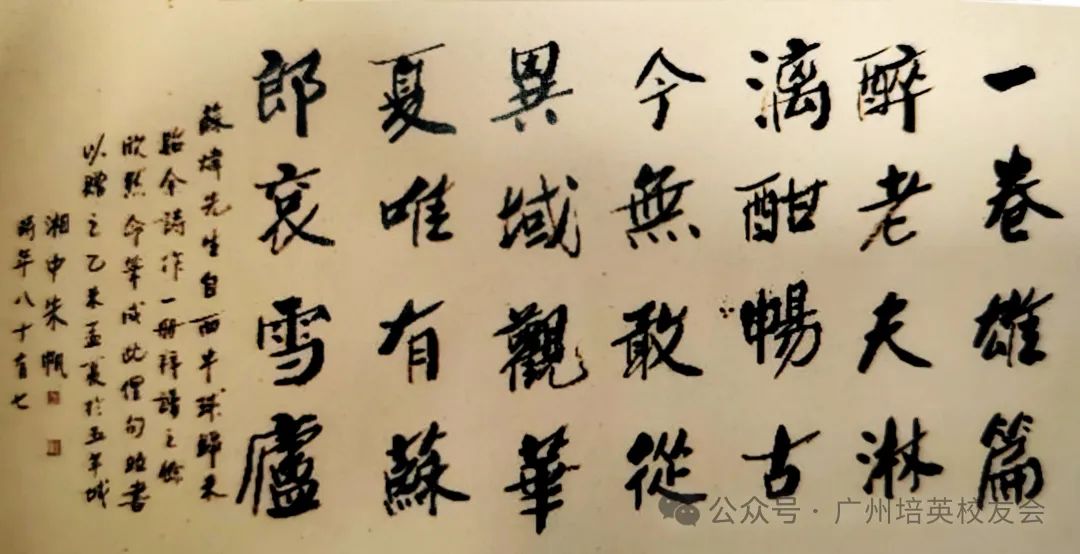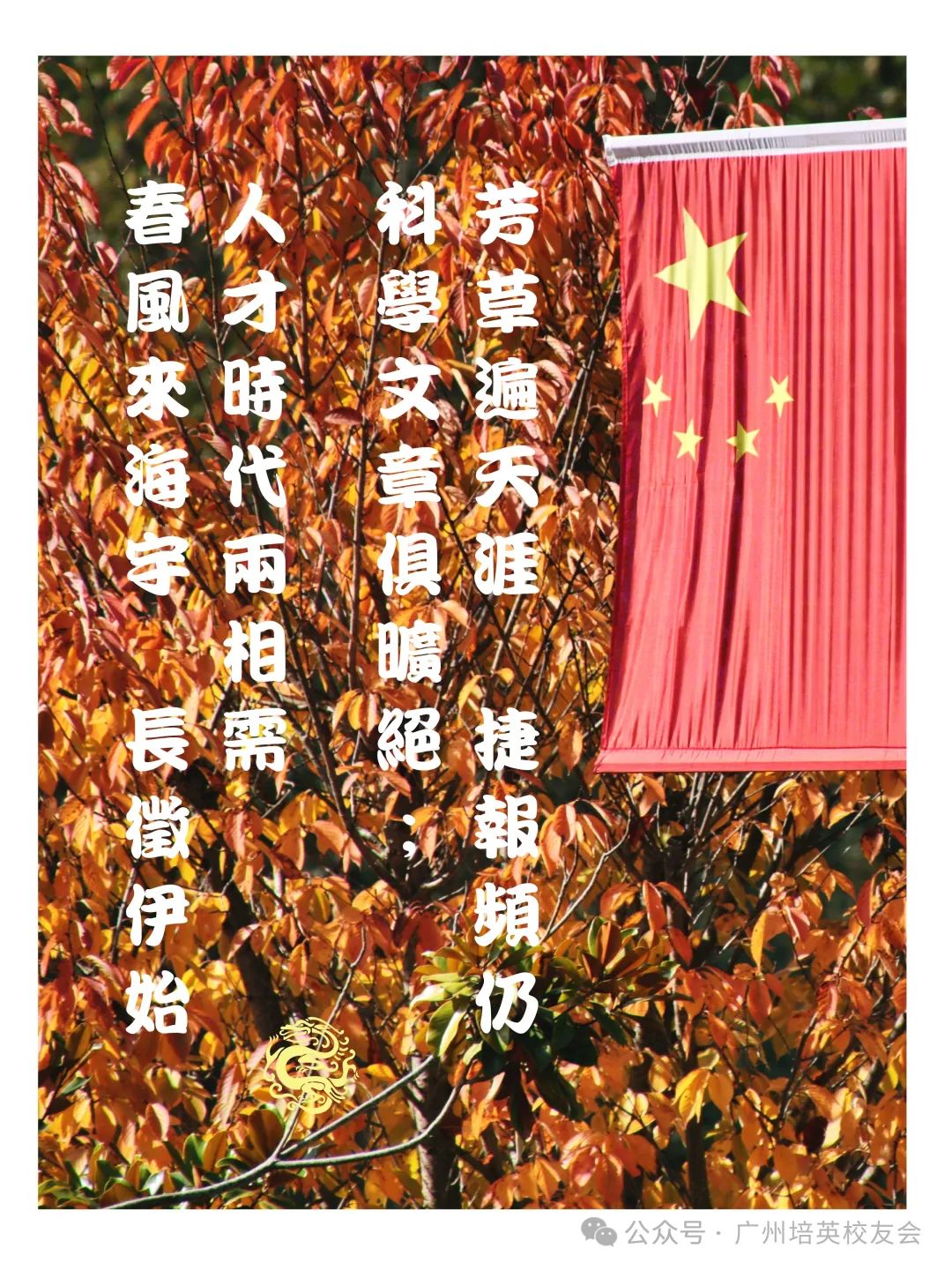 培英校友遍及全世界,像芳草綠遍天涯,他們中不少人,已是国際科技文化界著名的耆宿學者。祖国進行改革開放,他們在海外的科研成果的捷報,便不断地飛回母校。上聯寫的便是這樣一個情景。